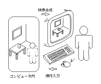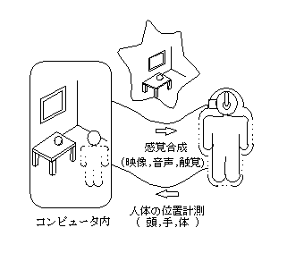 VRシステムでは、マウスやモニターなどの入出力装置の代わりにデータグローブやヘッドマウンテッドディスプレイなどのVRのための特別な入出力装置を用いる。データグローブやデータスーツは、人体の動きそのものを計測・入力することができ、人間が日常行っている自然な動作による入力を可能にする。また、ヘッドマウンテッドディスプレイは人間の頭の動きにあわせて目に見える映像が変化するので、モニターの映像を見る感覚ではなく、人間が日常外界のシーンを見ているのに近い感覚でものを見ることができる。このとき人間の動作に応じて、映像だけでなく音や体感など様々な感覚情報を合成して人間に伝えれば、人間はコンピュータの外にいるのにも関わらず、コンピュータ内に表現された世界にいる感覚を受けることになる。言い替えればコンピュータ内の仮想世界に入り込んだ体験ができることになる(図2)。