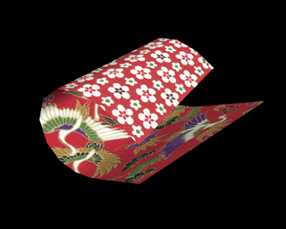 The third type of folding operation called 'Tucking in' folds faces to the inside direction bounded by a certain face (Figure 1(c)). In the present system, 'Tucking in' is limited to a symmetrical operation shown in Figure 1c. Selection of 'Folding up' or 'Tucking in' is specified by a button. More complex folding can be realized by combining more than one 'Tucking in' and 'Folding up' . Figure 2 shows two stages in folding a paper crane.