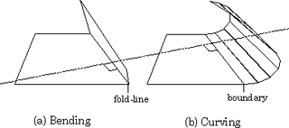 Fig.11 Bending and Curving whose picked vertices are put in the same position. The lines dividing the curved face are parallel to the fold-line in Bending.