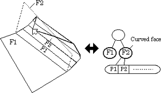 The face is divided at the boundary in the curving operation and the associated list is updated. The facecell corresponding to the round part is given a flag of curve and a sequence of vertices in the ribbon polygons is added. In the same way, the edgecell constituting a curve is also given the curve flag and the sequence of vertices is also obtained. This process is executed only once for an edge. The round part of the curved face by itself constitutes a face group with the attribute of the curved face, and is not modified by any folding operations afterwards.