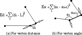 To decrease Ed, if the vertex distance is smaller than the optimal distance, corresponding vertices are moved to increase the distance. To reduce Ea, vertex positions are shifted to the direction shown in Figure 15(b). The amount of modification is in proportion to the above mentioned errors or differences. Suitable values of constants a and b are determined experimentally. In implementing the system on a graphics workstation, this modification is repeated during the refreshment of monitor screen. When the number of variable vertices is 15, for example, this iteration is performed 100 times in 33ms.