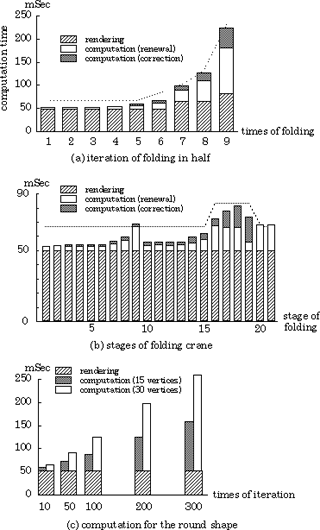 Figure 16 (a) shows results in the case of a face being folded in half repeatedly. Computational time consists of renewal time including the correcting time explained in 2.3. All of those times were measured independently. Dotted lines show the actual time when these processes are simultaneously executed and it is slightly different from the total of each component because the timing of rendering is adjusted to the refreshment of the screen. For the same reason, the rendering time always requires more than 50ms. The computation time of renewal and correction of faces depends on the number of faces. On the other hand, the rendering time is almost constant through folding processes. The number of faces increases as the paper is folded, it reaches 512 (= 29) after folding nine times and the processing time rises to 250ms in this case. In real folding, however, it is impossible to fold so many times because of the thickness of a paper sheet.