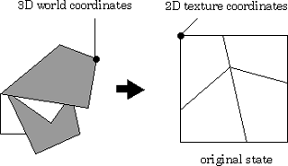Fig.4 Two kinds of coordinates of the vertices. The 2D coordinates on the original texture image correspond to the texture coordinates.
