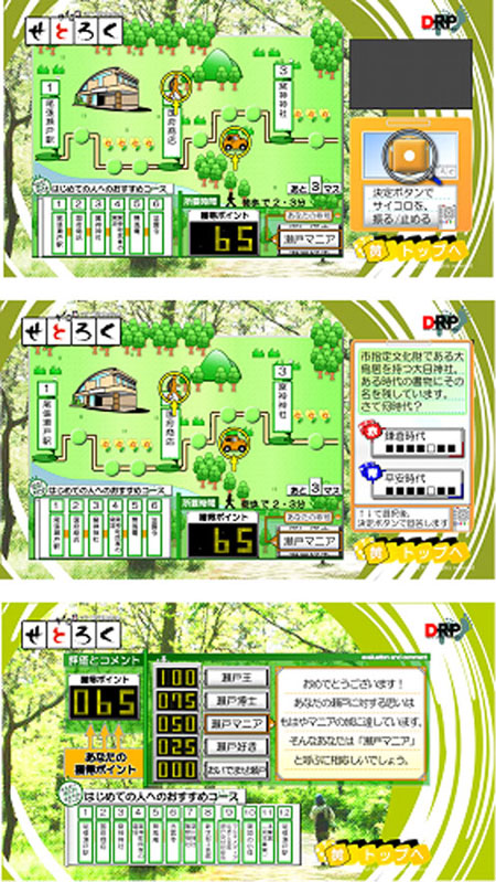 「せとろく」では、瀬戸市の名所、旧跡などを紹介します。双六のゲーム感覚で瀬戸市を知ってもらうことができます。詳細は研究発表原稿をご覧ください。